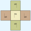 Using the edge relationships, add a tile adjacent to each edge. Flags and colors show how each tile is oriented.