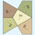 Using the edge relationships, add a tile adjacent to each edge. Flags and colors show how each tile is oriented.