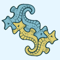 This artwork uses tessellation symmetry Pentagons with 4-way rotation.