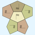 Using the edge relationships, add a tile adjacent to each edge. Flags and colors show how each tile is oriented.