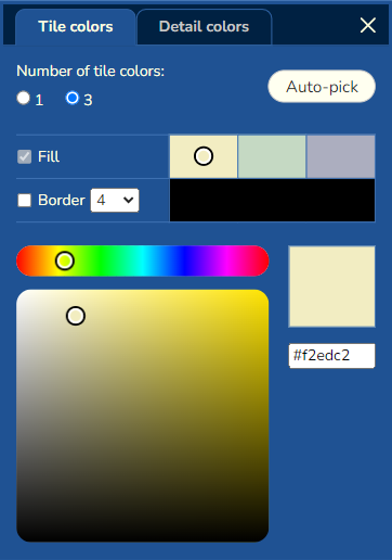 On the “Tile colors” tab, try hitting the “Auto-pick” button a few times to find a color scheme you like. Or set tile colors individually, adjusting each tile color in the “Fill” row by selecting its swatch and using the color controls. You can also add tile borders using the controls in the “Border” row.