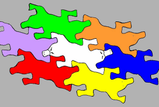 Back to topGerman mathematician Heinrich Heesch proved in 1932 that there are exactly 28 ways to tile a flat surface with asymmetric tiles — that is, where tiles have no internal reflection or rotation and all edges are shapeable. Each of these 28 “Heesch types” underlies artworks on this site.
