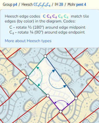 For more examples you can click the "Heesch" header on any symmetry page to see how the codes relate to a diagram or artwork. Here's part of the page for Pentagons with 4-way rotation, showing details of the Heesch type along with “Under the Sea” by Henk Wyniger: