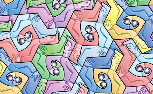And there are fascinating worlds of non-periodic tessellations, where tiles fill space without translational symmetry; Alain Nicolas has many fine examples such as Boules Player shown here. See also Penrose tiles, as well as John A. L. Osborn's Bats & Lizards and Beetles.