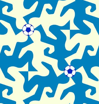 Often such an artwork uses one of our 35 symmetries, with each tile divided into two or more distinct tiles. Alain Nicolas gives a nice presentation, with examples such as this leaf and rabbit.And sometimes several figures in a single-tile tessellation share a differently-shaped tile, as in soccer4 by Makoto Nakamura (at left).