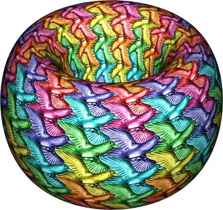 Some artists have explored tiling three-dimensional surfaces. Dominique Ribault’s site shows his tessellations on a sphere, cone, donut, and knot, as well as two types of spiral. (Scroll down to “SURFACES 3D”). And Makiya Torigoe's site includes tessellations aligned on four platonic solids, such as his Ray on a cube. Note in each artwork how the pattern is different at the corners. (Section “Ju+Ten kaizu”).